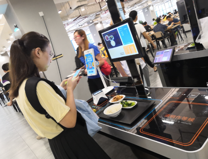 把餐盤放在一臺四四方方的終端設(shè)備的結(jié)算區(qū),設(shè)備就能自動感應(yīng)到,并在屏幕上詳細(xì)顯示飯菜的熱量、蛋白質(zhì)、脂肪、碳水化合物含量,以及這頓飯的費用。而這些數(shù)據(jù),用戶可以通過手機APP應(yīng)用程序詳細(xì)查看,并定期接收到個性化定制的膳食搭配建議……