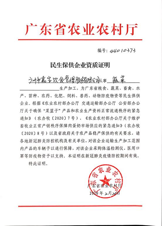 農(nóng)產(chǎn)品是生活必需品,嘉寶獲批“民生保供企業(yè)”資質(zhì)證明,各地新冠肺炎防控機構(gòu)及有關(guān)單位,對嘉寶運輸生產(chǎn)加工范圍內(nèi)產(chǎn)品的車輛將予以通行保障,對采購體溫檢測儀、醫(yī)用口罩等防疫物資予以支持。有利于嘉寶開展農(nóng)產(chǎn)品和農(nóng)業(yè)生產(chǎn)加工的保供工作。